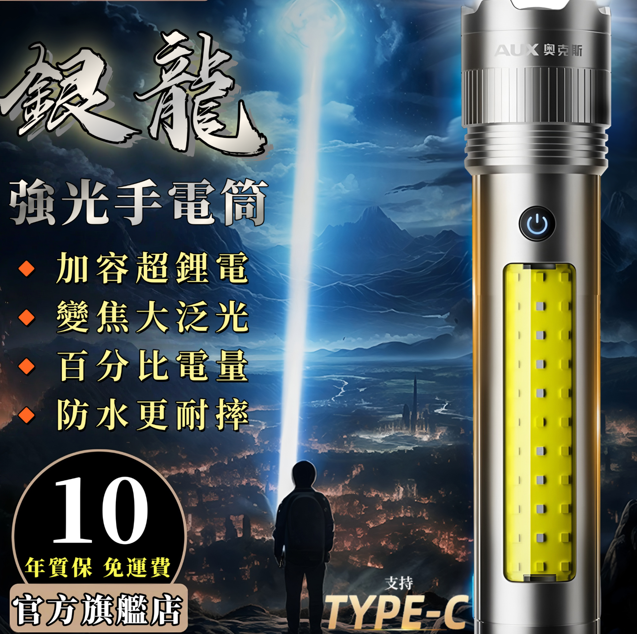 奧克斯銀龍強光手電筒超亮雷射戶外鐳射巡邏家用遠射長續航大功率,遠射5000++超長續航,全新6大升級,照明更亮!更耐用!